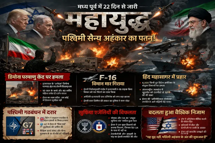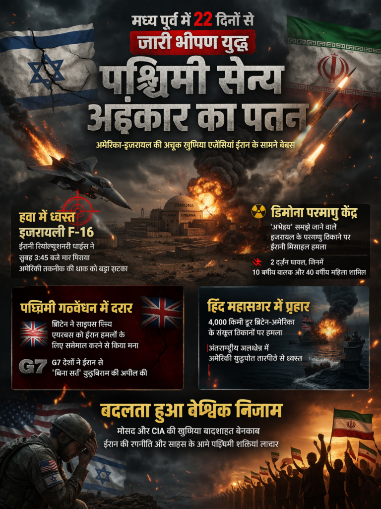मध्य पूर्व (Middle East) में पिछले 22 दिनों से जारी भीषण युद्ध ने दुनिया के सैन्य समीकरणों को पूरी तरह बदल कर रख दिया है। अमेरिका और इजरायल, जो अपनी खुफिया एजेंसियों—मोसाद और सीआईए—की अचूकता का दंभ भरते थे, आज ईरान की रणनीतिक जवाबी कार्रवाई के सामने बेबस नजर आ रहे हैं। यह युद्ध अब केवल दो देशों के बीच की जंग नहीं, बल्कि पश्चिमी देशों के सैन्य अहंकार के पतन की गाथा बनता जा रहा है।