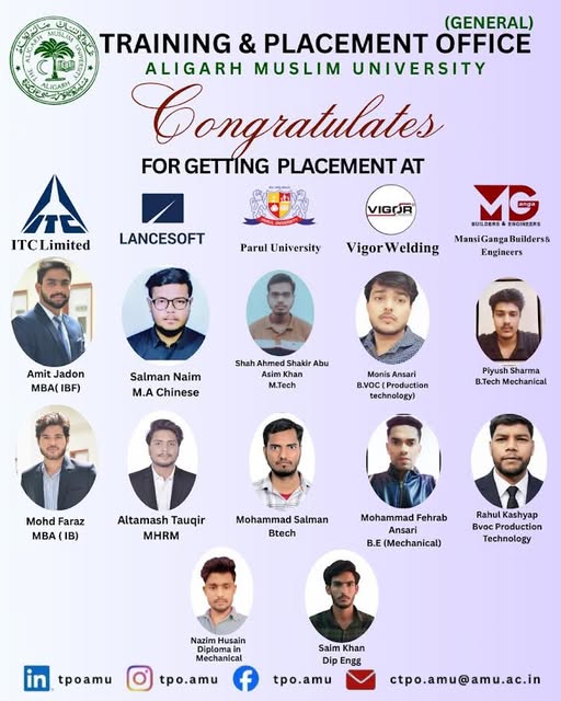 AMU के ट्रेनिंग एंड प्लेसमेंट ऑफिस (जनरल) द्वारा आयोजित कैंपस भर्ती अभियान में इस बार 12 छात्रों ने प्रतिष्ठित कंपनियों में नौकरी के अवसर हासिल किए हैं। यह विश्वविद्यालय की उद्योग-उन्मुख शिक्षा और कौशल विकास पर निरंतर फोकस का प्रमाण है।