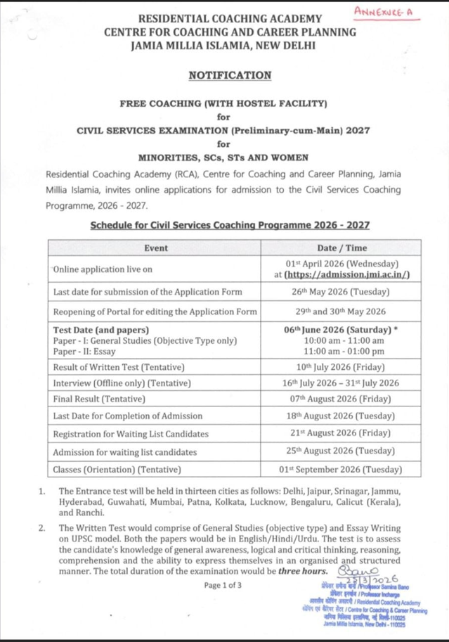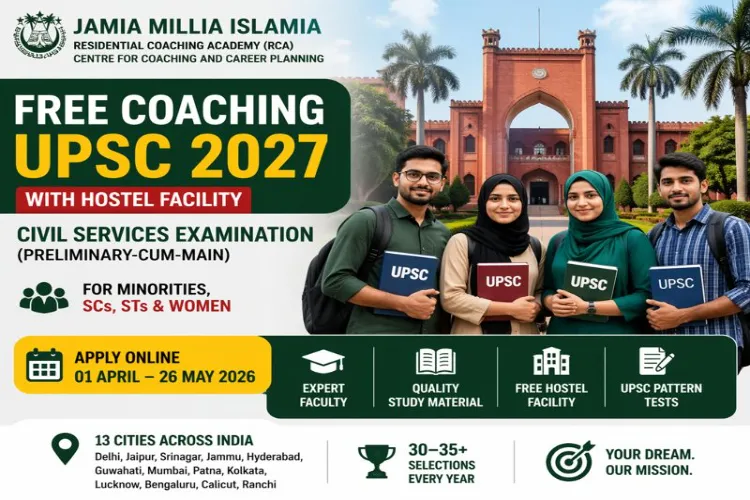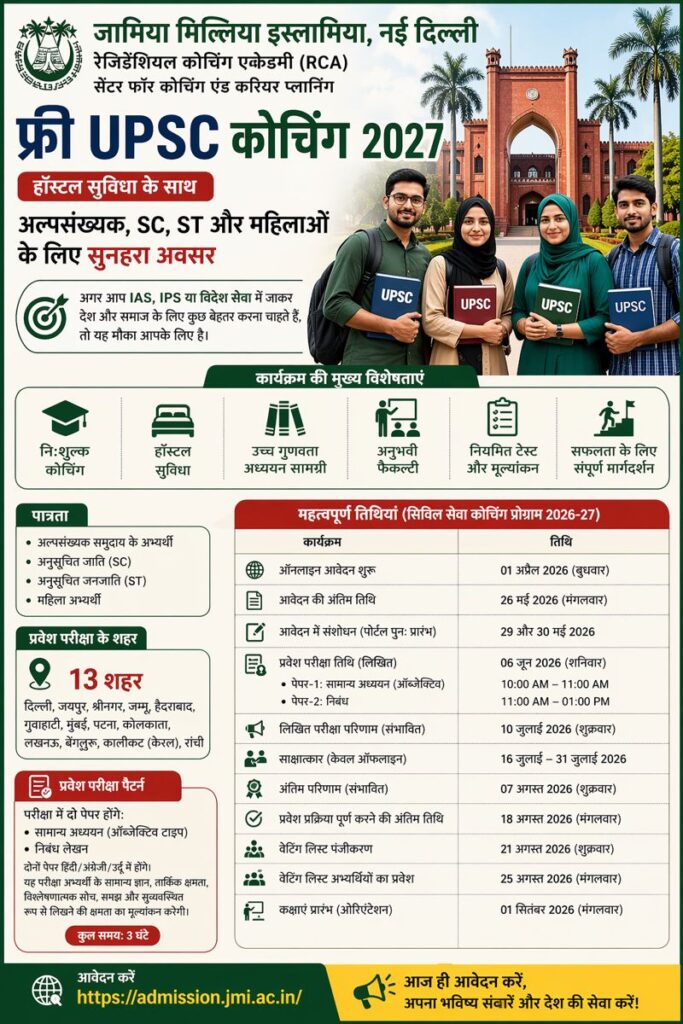 गर आपमें देश सेवा का जज्बा है और आप आईएएस (IAS), आईपीएस (IPS) या आईएफएस (IFS) बनकर अपनी और अपने समाज की तकदीर बदलना चाहते हैं, तो यह खबर आपके लिए जीवन बदलने वाली साबित हो सकती है। दिल्ली स्थित जामिया मिल्लिया इस्लामिया की रेसिडेंशियल कोचिंग एकेडमी (RCA) ने सिविल सेवा परीक्षा 2027 की तैयारी के लिए फ्री कोचिंग और हॉस्टल सुविधा के लिए आवेदन आमंत्रित किए हैं।