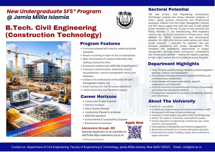 तेजी से बढ़ते कंस्ट्रक्शन सेक्टर में करियर बनाने के इच्छुक युवाओं के लिए जामिया मिल्लिया इस्लामिया का यह नया B.Tech Civil Engineering (Construction Technology) प्रोग्राम एक मजबूत लॉन्चपैड साबित हो सकता है।