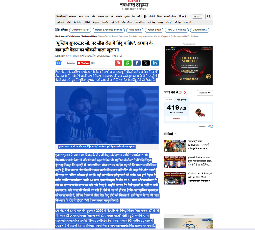 हिंदी दैनिक नवभारत टाइम्स (NBT) में प्रकाशित हनी त्रेहान के विस्तृत इंटरव्यू से यह साफ संकेत मिलते हैं कि देश में चल रही तथाकथित ‘सांस्कृतिक युद्ध’ की आंच अब बॉलीवुड तक पहुंच चुकी है। यह केवल फिल्मों की पसंद या नापसंद का सवाल नहीं रह गया है, बल्कि यह रचनात्मक स्वतंत्रता, प्रतिनिधित्व और डर के माहौल से जुड़ा गंभीर मुद्दा बन चुका है।