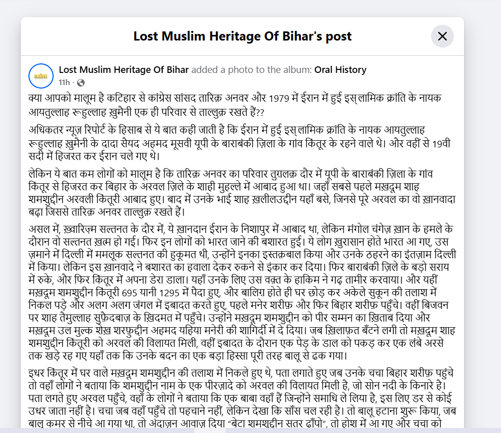 यह दावा “Lost Muslim Heritage of Bihar” नाम के एक सोशल मीडिया हैंडल पर प्रकाशित एक लेख के बाद तेजी से फैल गया। इस लेख में इतिहास और वंशावली के आधार पर दोनों परिवारों के बीच एक दूर का सांस्कृतिक और ऐतिहासिक रिश्ता होने की बात कही गई है। हालांकि इस दावे की स्वतंत्र पुष्टि अभी तक किसी आधिकारिक स्रोत से नहीं हुई है। फिर भी यह चर्चा इतिहास, प्रवासन और भारतीय उपमहाद्वीप तथा ईरान के पुराने संबंधों को समझने का एक दिलचस्प अवसर जरूर देती है।