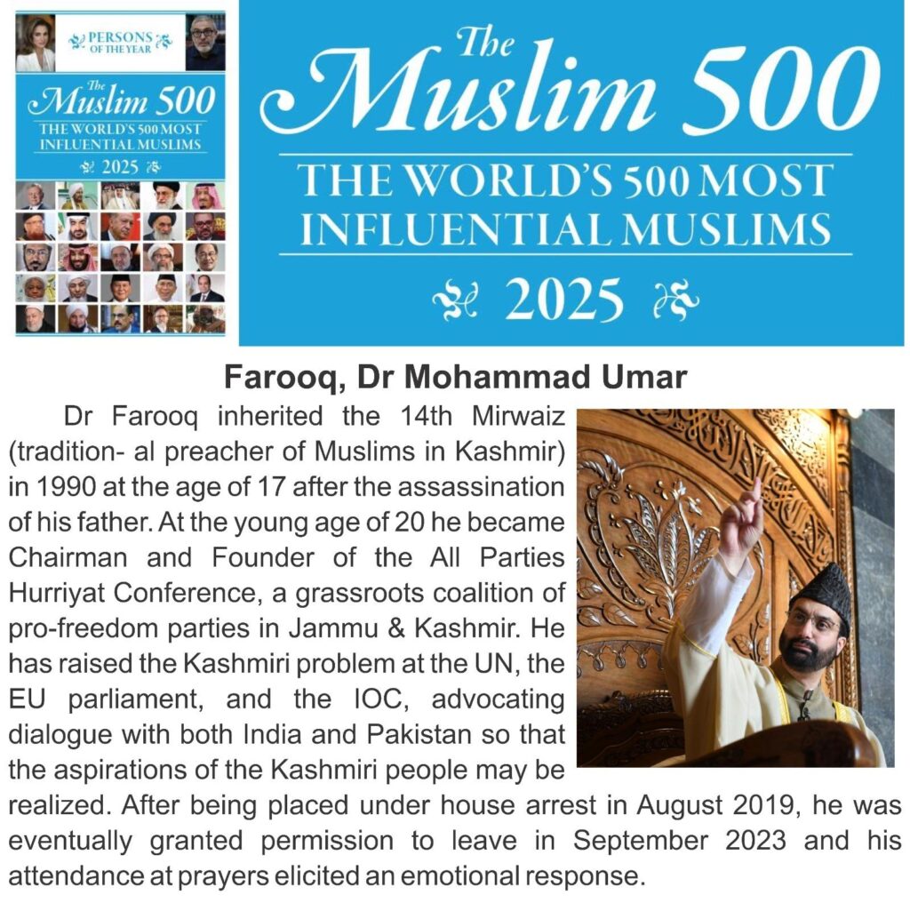 अम्मान, जोर्डन स्थित रॉयल इस्लामिक स्ट्रैटेजिक स्टडीज सेंटर (RISSC) ने इस वर्ष भी कश्मीर के मीरवाइज डॉ. मौलवी मुहम्मद उमर फारूक को विश्व के “500 सबसे प्रभावशाली मुसलमानों” की प्रतिष्ठित सूची में शामिल किया है।