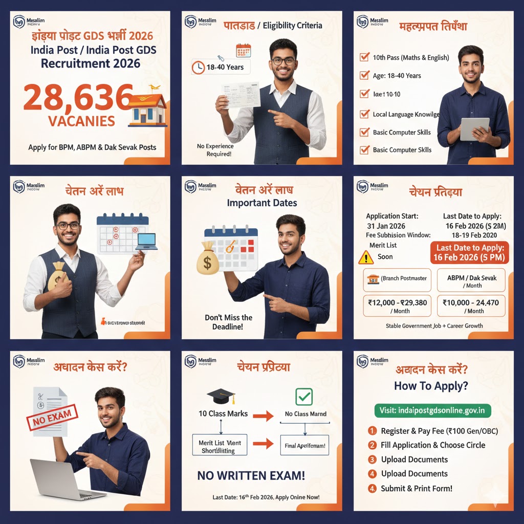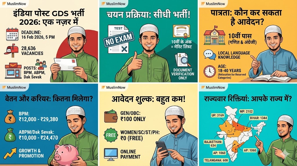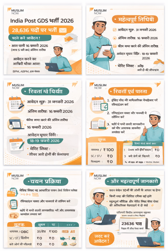 देशभर के बेरोजगार युवाओं, खासकर ग्रामीण इलाकों में रहने वाले मुस्लिम युवाओं के लिए आज बड़ा अवसर है। इंडिया पोस्ट ग्रामीण डाक सेवक (GDS) भर्ती 2026 के तहत 28,636 पदों पर नियुक्ति की प्रक्रिया चल रही है और आवेदन की अंतिम तिथि आज, 16 फरवरी 2026 (शाम 5 बजे तक) निर्धारित है। जो उम्मीदवार अभी तक आवेदन नहीं कर पाए हैं, वे तुरंत आधिकारिक पोर्टल पर जाकर ऑनलाइन फॉर्म भरें।