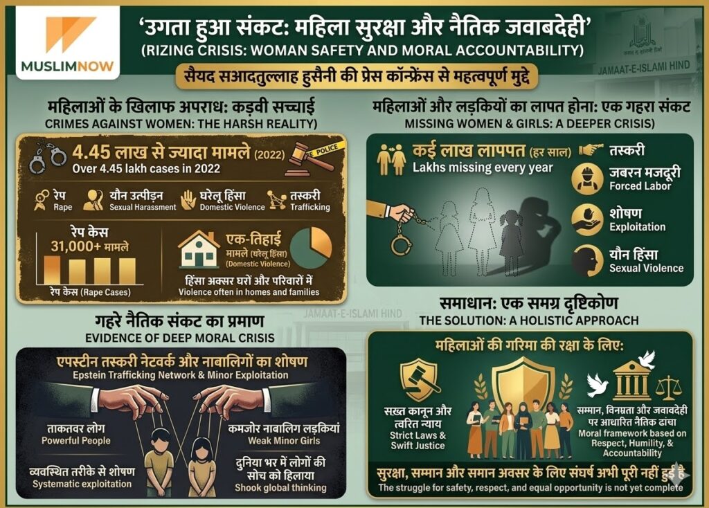 अध्यक्ष ने समाज में व्याप्त नैतिक संकट पर भी बात की। उन्होंने एपस्टीन तस्करी नेटवर्क जैसे मामलों का जिक्र किया। इसमें ताकतवर लोगों ने व्यवस्थित तरीके से नाबालिग लड़कियों का शोषण किया। जमाअत-ए-इस्लामी हिंद का मानना है कि केवल सख्त कानून काफी नहीं हैं। इसके लिए समाज में सम्मान, विनम्रता और जवाबदेही पर आधारित एक मजबूत नैतिक ढांचा तैयार करना होगा।