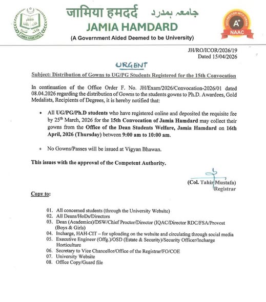 नोटिस के मुताबिक, सभी पंजीकृत छात्र, विशेषकर गोल्ड मेडल विजेता और डिग्री प्राप्तकर्ता, 16 अप्रैल, 2026 (गुरुवार) को सुबह 9:00 बजे से 10:00 बजे के बीच जामिया हमदर्द स्थित ‘छात्र कल्याण अधिष्ठाता’ (Dean Students Welfare) के कार्यालय से अपना गाउन प्राप्त कर सकते हैं।