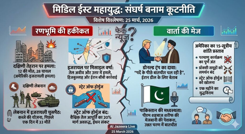 निष्कर्ष: मिडिल ईस्ट इस वक्त एक ऐसे दोराहे पर है जहाँ एक तरफ विनाशकारी महायुद्ध का विस्तार है और दूसरी तरफ एक कठिन शांति समझौता। अगले कुछ दिन यह तय करेंगे कि