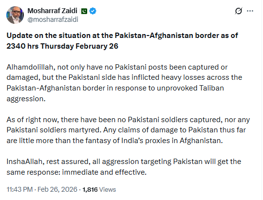 संघीय सूचना मंत्री अता तरार ने दावा किया कि पाकिस्तान की कार्रवाई में 36 अफगान सैनिक मारे गए हैं, जबकि दो पाकिस्तानी जवान शहीद और तीन घायल हुए। हालांकि, पाकिस्तानी पक्ष ने अफगान दावे—कि 40 चौकियों पर कब्जा किया गया—को “झूठा प्रचार” बताया है।