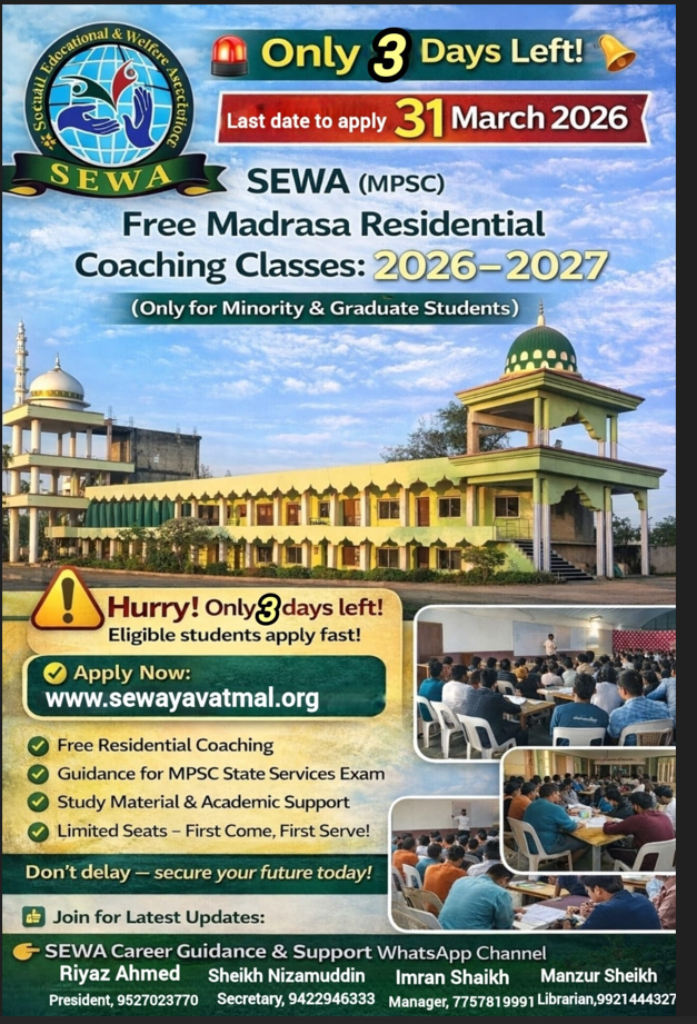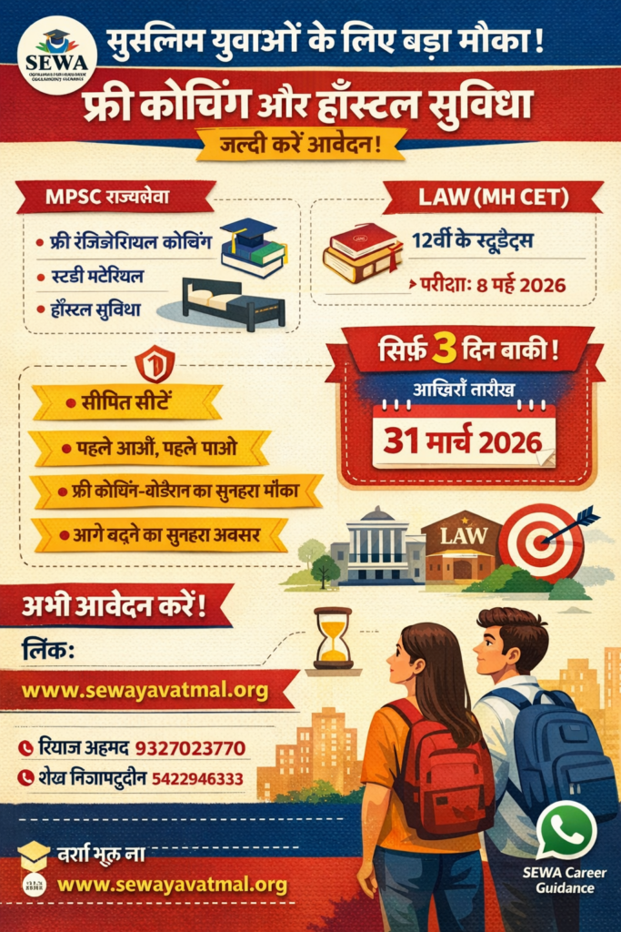 महाराष्ट्र के मुस्लिम युवाओं के लिए शिक्षा और करियर के क्षेत्र में आगे बढ़ने का एक बड़ा अवसर सामने आया है। सोशल एजुकेशन एंड वेल्फेयर एसोसिएशन (SEWA) की नागपुर शाखा ने एक ऐसी पहल शुरू की है, जो न सिर्फ छात्रों को प्रतियोगी परीक्षाओं की तैयारी में मदद करेगी, बल्कि उन्हें बेहतर भविष्य की दिशा भी दिखाएगी। यह पहल खास तौर पर उन छात्रों के लिए है जो आर्थिक या सामाजिक कारणों से उच्च शिक्षा और प्रतियोगी परीक्षाओं की तैयारी नहीं कर पाते।