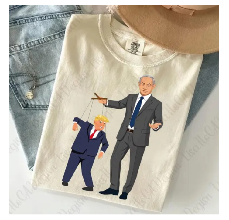 ‘ईटसी’ (Etsy) और ‘टीपब्लिक’ जैसी साइट्स पर आप ऐसी टी-शर्ट्स देख सकते हैं जहाँ ट्रंप साहब को एक मासूम ‘कुत्ता’ बनाकर पेश किया गया है, जिसके गले में पट्टा है। और मजे की बात? उस पट्टे की डोर बेंजामिन नेतन्याहू के हाथ में है। एक अन्य डिजाइन में नेतन्याहू को एक ‘कठपुतली संचालक’ दिखाया गया है जो ट्रंप को अपनी उंगलियों पर नचा रहे हैं।