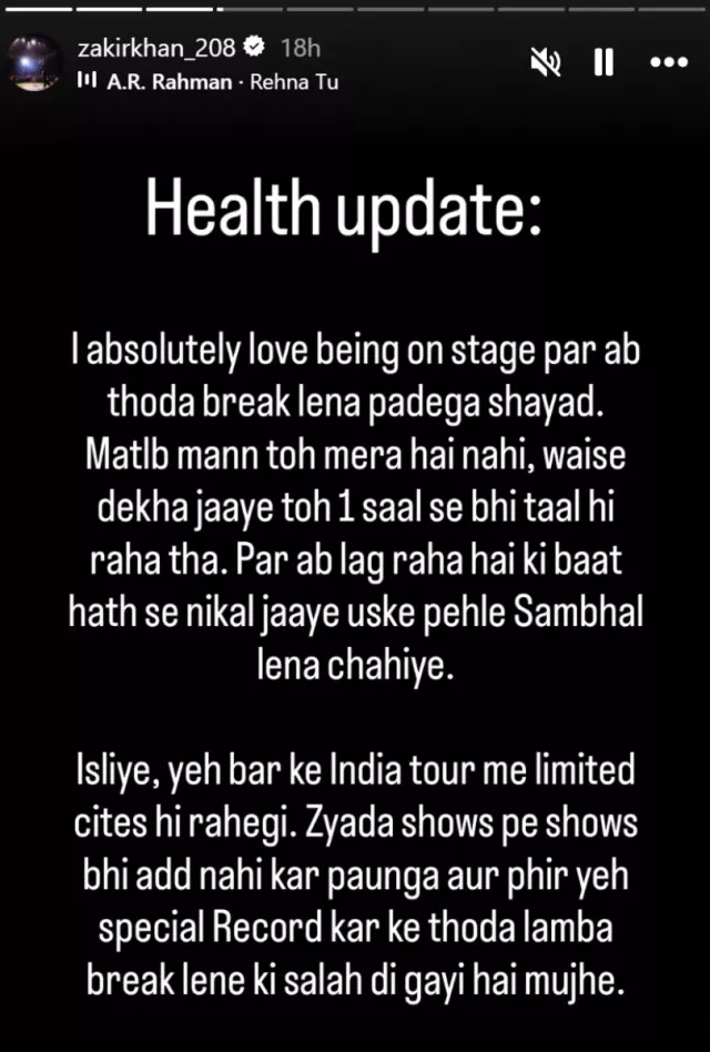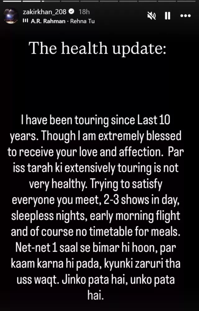 6 सितंबर 2025 को इंस्टाग्राम स्टोरी पर पोस्ट किए गए संदेश में ज़ाकिर ने बताया कि वह पिछले एक साल से गंभीर स्वास्थ्य समस्याओं से जूझ रहे हैं। लगातार शो, यात्रा और अनियमित दिनचर्या ने उनकी सेहत पर गहरा असर डाला है। उन्होंने लिखा,